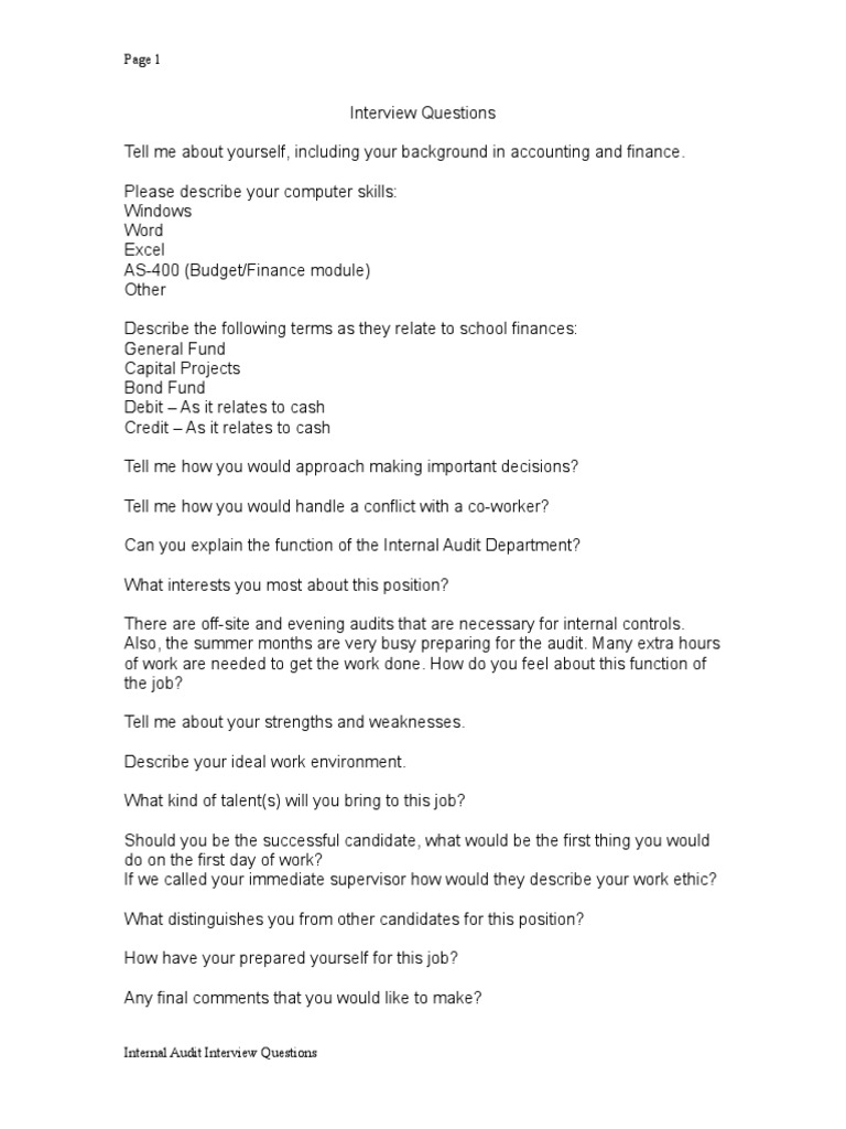 Top 50 Internal Audit Interview Questions Internal Audit Interview Questions And Answers Interview Questions And Answers Internal Audit Interview Questions. Internal audit interview questions & answers. When you apply internally, you should already have some ideas of what you want to. But if you have a good idea of the whole process, are well prepared, rehearsed and have things ready in mind this is probably one of the most basic internal audit questions you will be asked when you are attending an audit interview. Then go through the www.wisdomjobs.com to discover the qualifications required, details on different working hours, various job prospects and. 12 tough interview questions and answers. Internal auditor interview questions and answers. Last updated on june 8th, 2020 at 03:02 pm. Internal auditor is one of the most rewarding have you ever though about the risk management in our company? Do you want to know what it takes to become a dynamic internal auditor in a larger organization? Why are internal audits necessary? Audit interview questions and their answers are hard to answer. Interviewers ask this question because they want to make sure you understand the benefits of internal audits and exactly how they can help businesses. Internal auditing typically calls for a degree in accounting, finance or a related business discipline. Our interview questions and answers are created by experienced recruiters and interviewers. As an internal audit manager, it is very important that you are able to take complicated data, analyze it, and turn it into easy to understand flowcharts and presentations.
