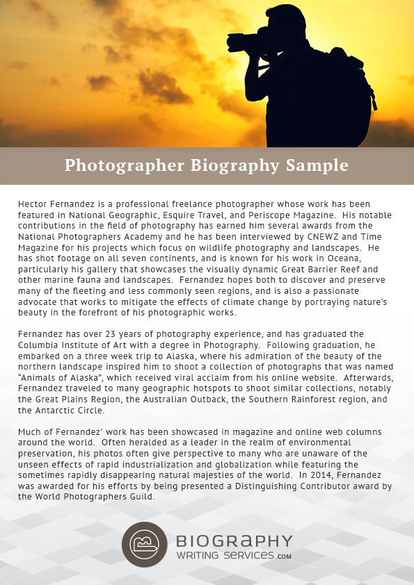 11 Incredible Biography Samples To Use In 2018. Your bio becomes the crucial moment when it comes to the client. Many photographers confess that they had no idea that these couple of paragraphs can make a huge difference. As photographers, it's our job to make people look good. Here are some tips to help you craft an awesome bio. If you need a good sample to be written for you, you should come to us and choose the best one for you. Photography bios help understand the type of personality you have and estimate whether working with you would be efficient and easy. I don't want to be melodramatic about it, but your website bio can make or break you. Photography bio is important if you want your name be recognizable. All of the samples that we provide are. Your photographer biography, as well as artist biography or author bio, could be used for many reasons from advertising your services on your own personal website to applying for a photography bio is a description about yourself and the services you are able to render as a photographer. It's interesting, then, how difficult it can be for so many of us to write solid bios for our websites. Your photographer instagram bio is the first thing people see, so you need to get it right. When it comes to using biography samples, you need to choose the best so that all of your hard work wont go to waste. What visitors find written on your website influences on their decision. That's why they either totally neglected the about page is the exact step that is standing between you and the client.